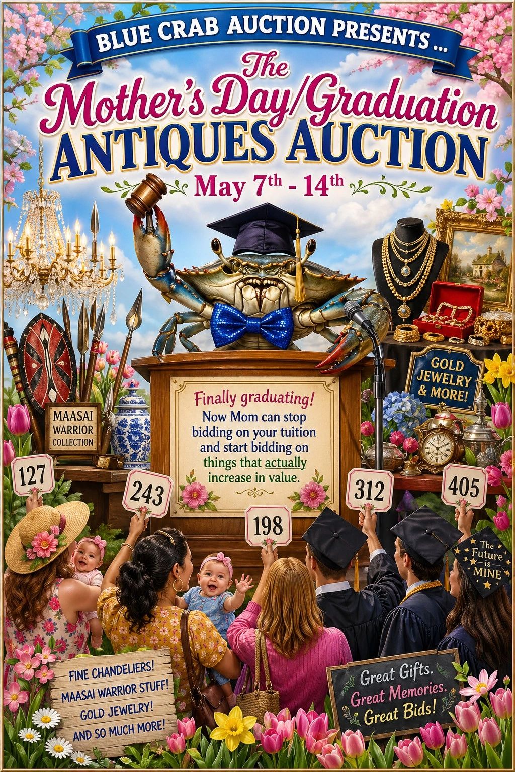 Welcome to our The Mother's Day/Graduation Antiques Auction. Our team of skilled auctioneers bring you an eclectic collection of rare and unique items to bid on. From antique furniture to fine art, we have it all. Join us and experience the thrill of the auction!